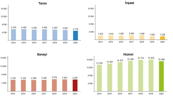 2020 yılında 4 milyon 716 bin kişi tarım sektöründe, 5 milyon 497 bin kişi sanayi sektöründe, 1 milyon 538 bin kişi inşaat sektöründe, 15 milyon 60 bin kişi hizmet sektöründe istihdam edildi. Bir önceki yıl ile karşılaştırıldığında istihdam edilenlerin sayısı tarım sektöründe 381 bin, sanayi sektöründe 64 bin, inşaat sektöründe 12 bin, hizmet sektöründe 812 bin kişi azaldı.
