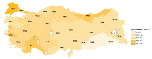 En yüksek işgücüne katılma oranı %55,9 ile TR21 (Tekirdağ, Edirne, Kırklareli) Bölgesi'nde gerçekleşti. En düşük işgücüne katılma oranı ise %38,4 ile TRC2 (Şanlıurfa, Diyarbakır) Bölgesi'nde oldu.