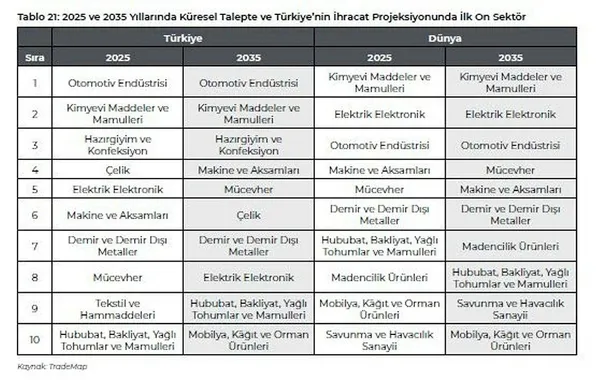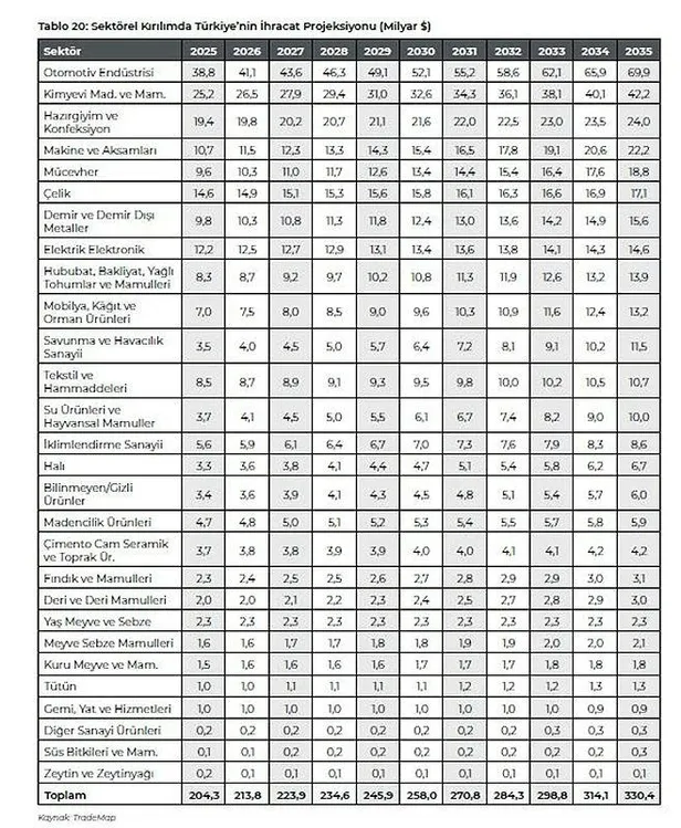 Raporda; gelecekte ihracatta en çok hangi sektörlerin yıldızının parlayacağı ve yıllık ihracat öngörüleri de yer aldı. 2035 yılında 69,9 milyar dolarlık ihracat yapması beklenen Otomotiv Endüstrisi'nin ilk sırada, 42,2 milyar dolar ile Kimyevi Maddeler ve Mamulleri'nin ikinci sırada, 24 milyar dolar ile Hazır giyim ve Konfeksiyon sektörünün üçüncü sırada olacağı öngörüsü de rapora yansıdı.