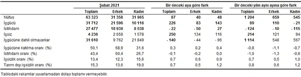 İşgücü 2021 yılı Şubat ayında bir önceki aya göre 226 bin kişi artarak 31 milyon 712 bin kişi, işgücüne katılma oranı ise 0,3 puanlık artış ile %50,1 olarak gerçekleşti.