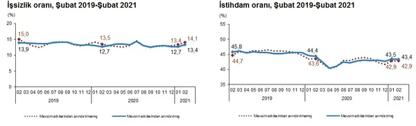 Türkiye genelinde 15 ve daha yukarı yaştaki kişilerde işsiz sayısı 2021 yılı Şubat ayında bir önceki aya göre 250 bin kişi artarak 4 milyon 236 bin kişi oldu. İşsizlik oranı ise 0,7 puanlık artış ile %13,4 seviyesinde gerçekleşti.
