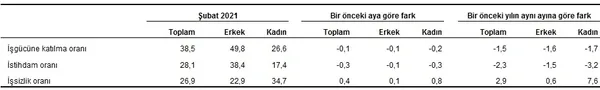 Zamana bağlı eksik istihdam, potansiyel işgücü ve işsizlerden oluşan atıl işgücü oranı 2021 yılı Şubat ayında bir önceki aya göre 1,2 puan azalarak %28,3 oldu. Zamana bağlı eksik istihdam ve işsizlerin bütünleşik oranı %19,8 iken, potansiyel işgücü ve işsizlerin bütünleşik oranı %22,5 olarak gerçekleşti.