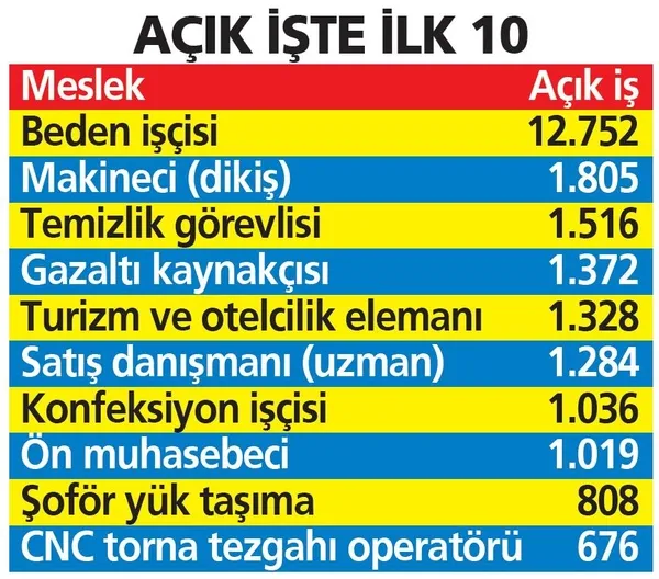 Özel sektör; acilen bin 805 makineci (dikiş), bin 516 temizlik görevlisi, bin 372 gazaltı kaynakçısı, bin 328 turizm ve otelcilik elemanı, bin 284 satış danışmanı arıyor. Bin 36 kişiyle konfeksiyon işçisi, bin 19 kişiyle ön muhasebeci en çok aranan elemanlar arasında yer alıyor. İş arayanlar, İŞKUR'un internet sitesinden üye olup, başvuru yapabiliyor.