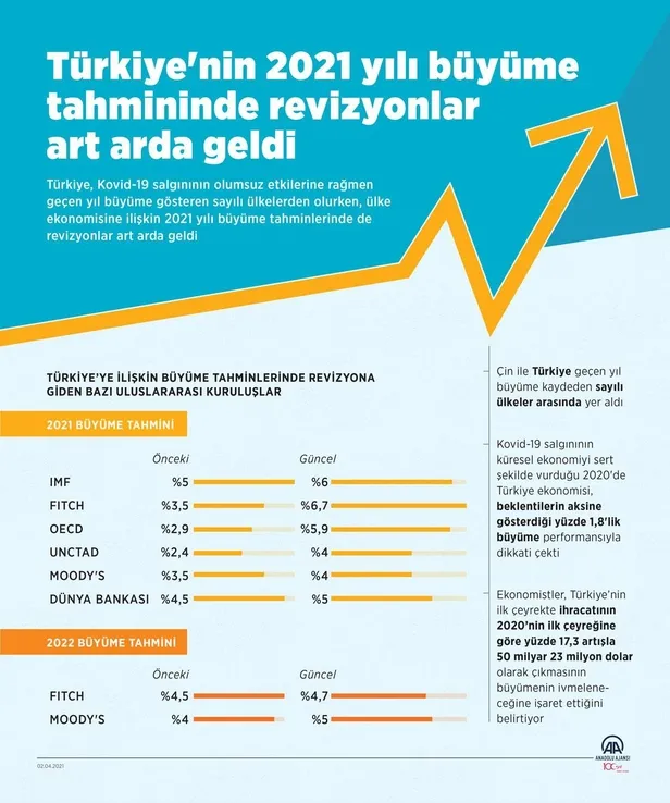 Geçen yıl Çin ile birlikte büyüme kaydeden sayılı ülkeler arasında yer alan Türkiye, ekonomi yönetiminin attığı adımlar ve aşılamayla hızlı toparlanma beklentileriyle bu yıla ilişkin büyüme tahminlerinin de yeniden gözden geçirilmesini sağladı.