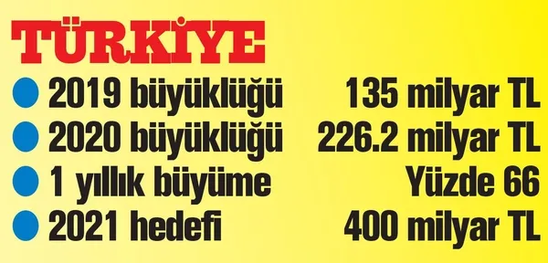 Türkiye'de ise e-ticaret hacmi rekor kırdığı 2020'de yüzde 66 artış göstererek 135 milyar liradan 226,2 milyar liraya yükseldi.