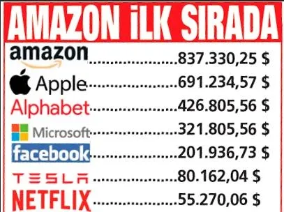Pandemide teknoloji şirketleri kasalarını doldurdu. 2020'de aralarında 7 büyük teknoloji şirketinin değeri 3.4 trilyon dolar arttı. Amazon ve Apple, 2020'nin son çeyreğinde ilk kez 3 aylık gelirde 100 milyar doları aştı. Bu yıla da iyi başlayan teknoloji şirketlerinin ilk 3 ayda elde ettiği kazancın dakika başına düşen tutarı hesaplandı. Buna göre; Amazon 1 dakikada 830 bin dolardan fazla gelir elde ederek ilk sırayı aldı. Apple da dakika başına 691 bin doları bulan para kazandı. İşte şirketlerin dakika başına düşen kazançları:,