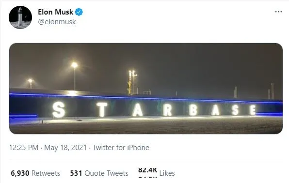 Musk, Boca Chica Village'ın adının Starbase (Yıldız üssü) olarak değiştirilmesini teklif etti. Musk paylaşımında, "Oradan Mars'a, dolayısıyla yıldızlara" ifadelerini kullanmıştı.