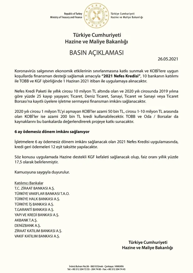 Hazine ve Maliye Bakanlığı, "Koronavirüs salgınının ekonomik etkilerinin sınırlanmasına katkı sunmak ve KOBİ’lere uygun koşullarda finansman desteği sağlamak amacıyla “2021 Nefes Kredisi”, 10 bankanın katılımı ile TOBB ve KGF işbirliğinde 1 Haziran 2021 itibarı ile uygulamaya alınacak." açıklamasında bulundu. Bakanlıktan yapılan açıklamada "2020 yılı cirosu 1 milyon TL’yi aşmayan KOBİ’ler azami 50 bin TL, cirosu 1-10 milyon TL arasında olan KOBİ’ler ise azami 200 bin TL kredi kullanabilecektir." denildi. İşletmelere 6 ay ödemesiz dönem imkanı sağlanacak 2021 Nefes Kredisi uygulamasında, kredi geri ödemeleri 12 eşit taksitte yapılacak. 2021 Nefes Kredisi uygulamasında Hazine destekli KGF kefaleti sağlanacak ve faiz oranı yıllık yüzde 17,5 olacak.