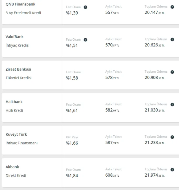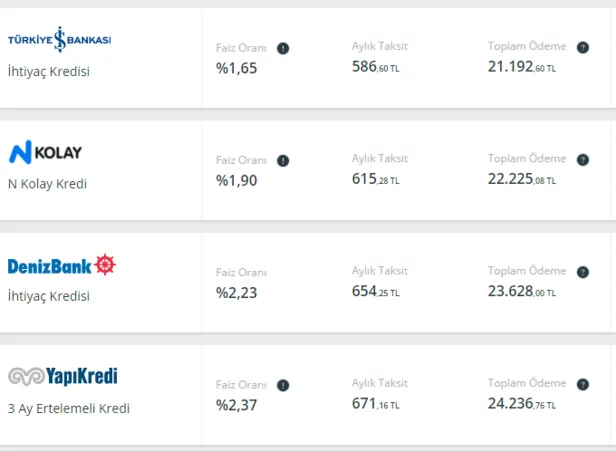 15 bin lira kredi çekmek isteyen bir vatandaşın aylık ödemesi ve senelik faiz şu şekilde: