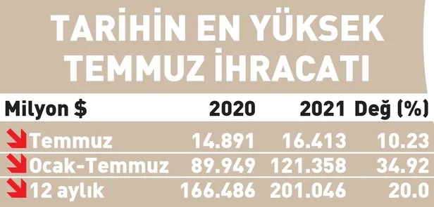 Türk ihracatçısı tarih yazmaya devam ediyor. 16.4 milyar dolarla en yüksek temmuz rakamına imza atılırken, 12 aylık ihracat ilk defa 200 milyar doları geçti. Yıllık ihracatta 2021 ve 2022 hedefleri şimdiden aşılmış oldu. Temmuz ayında 18 sektör ihracatını artırdı. 2 milyar dolarla otomotiv sektörü ilk sırada yer aldı.