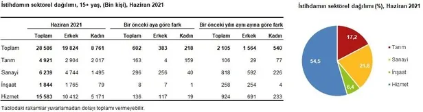 Haziran ayında istihdam edilenlerin sayısı bir önceki aya göre tarım sektöründe 163 bin kişi, sanayi sektöründe 296 bin kişi, inşaat sektöründe 8 bin kişi, hizmet sektöründe 136 bin kişi arttı. İstihdam edilenlerin %17,2'si tarım, %21,8'i sanayi, %6,4'ü inşaat, %54,5'i ise hizmet sektöründe yer aldı.