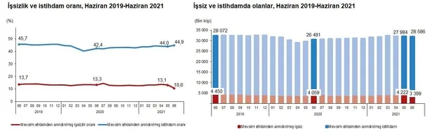Türkiye genelinde 15 ve daha yukarı yaştaki kişilerde işsiz sayısı 2021 yılı Haziran ayında bir önceki aya göre 823 bin kişi azalarak 3 milyon 399 bin kişi oldu. İşsizlik oranı ise 2,5 puanlık azalış ile %10,6 seviyesinde gerçekleşti.
