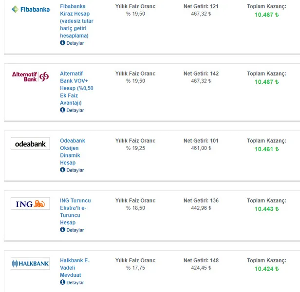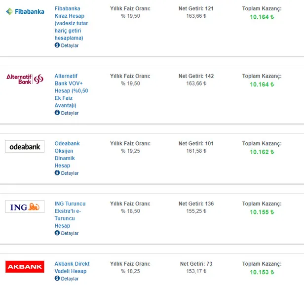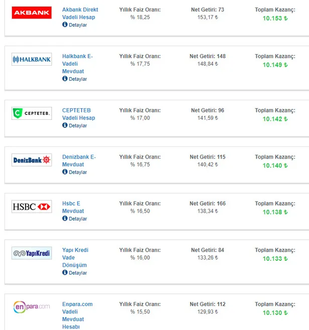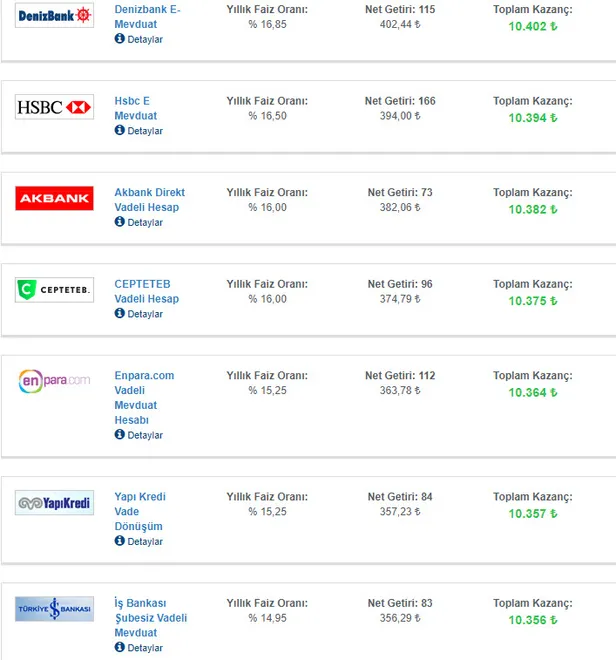 10.000 TL ayda ne kadar faiz geliri getirir? Son yıllarda artan altın ve döviz kurları vatandaşları farklı yatırımlara yöneltmeye başladı. Toplu ölçüde parası olup bir yatırım gerçekleştirmek isteyenlerin en sık başvuru ettiği usul ise faizdir. Yatırım gerçekleştirmek isteyen kişiler en çok faizi hangi bankanın verilen inceliyor. Vadeli mevduat hesapları, hemen nakit paraya dönüştürülemeyen, bankadan çekilmesi amacıyla belirli bir vakitnin (vade) dolması gerektiği, bu vakit dolunca ise faiz getirisiyle eş güdümlü çekilebilen ya da diğer bir vadeye yatırılan hesap türüdür. Vade uzadıkça faiz getirisi artar. Peki 20 Ağustos 2021 Cuma hangi banka ne kadar kazanç verir?
