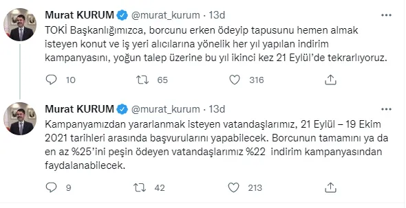 Çevre ve Şehircilik Bakanı Murat Kurum, TOKİ Başkanlığınca, borcunu erken ödeyip tapusunu hemen almak isteyen konut ve iş yeri alıcılarına yönelik her yıl yapılan indirim kampanyasının yoğun talep üzerine bu yıl ikinci kez 21 Eylül'de tekrarlanacağını bildirdi.