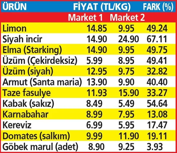 Fiyat farkında başı kabak çekiyor. Bir markette 14.90 liraya satılan 1 kilogram incir, diğer markette 24.90 liraya tüketiciye sunuluyor. Kabak bir markette 5.49, diğerinde 8.49 liraya; elma (starking) bir markette 9.95, diğerinde 14.90 liraya, çekirdeksiz üzüm bir markette 5.99, diğerinde 8.95 liraya tüketiciye sunuluyor. Alışverişe çıkmadan önce araştırma yapanlar aynı ürüne fazla ödeme yapmaktan kurtuluyor.