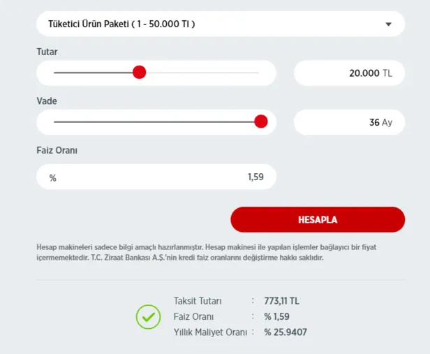 Ziraat Bankası sunduğu anında kredi imkanıyla beraber kişilere yüzde 1,64'lük faiz oranı ile 36 aya kadar vade sağlıyor. Aynı zamanda Ziraat Bankası geri ödeme konusunda büyük kolaylıklar sağlıyor.