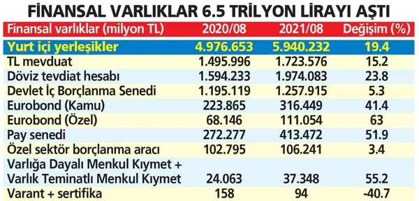 Yerli yatırımcıların döviz hesaplarındaki varlıkları yüzde 23.8 artarak 2021 Ağustos sonu itibariyle 1 trilyon 974 milyar liraya, Türk Lirası mevduatları ise 1 trilyon 723 milyar liraya çıktı.