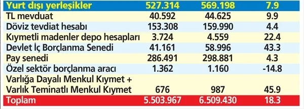 Veriler, aynı dönemde yurt dışı yerleşiklerin (yabancı yatırımcı) finansal varlıklarının da yüzde 7.9 oranında artarak 569.2 milyar liraya yükseldiğini ortaya koydu.