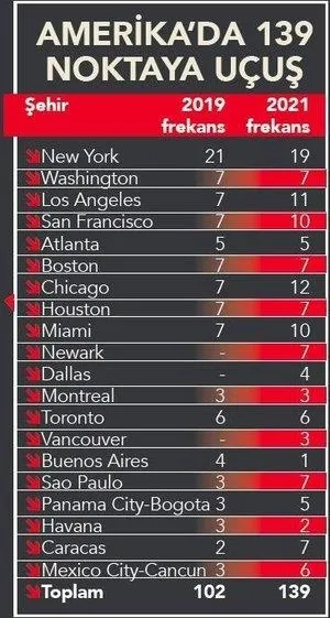Türkiye'nin bayrak taşıyıcısı Türk Hava Yolları da bu dönemde Amerika atağına başladı. Dünya havacılık tarihinin en parlak yıllarından biri sayılan 2019'da Amerika Kıtası'na haftada 102 sefer yapan şirket, bu dönemde haftalık uçuş sayısını 139'a çıkardı. Şirket geçtiğimiz günlerde Amerika kıtasındaki uçuş noktalarına Teksas eyaletinin 3'üncü büyük şehri olan Dallas'ı da ekleyerek, kıtadaki destinasyon sayısını 22'ye, dünya çapındaki toplam rota sayısını ise 327'ye çıkardı.