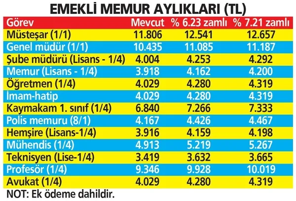 Yüzde 5'lik toplu sözleşme zammıyla Ocak artışı yüzde 7.21'ye ulaşacak. Halen en düşük memur emeklisi aylığı 3 bin 275 lira 90 kuruş. Bu maaş şu ana kadar gerçekleşen yüzde 6.23'lük (yüzde 5 zam+ yüzde 1.23 enflasyon farkı) orana göre 3 bin 480 liraya çıkacak.