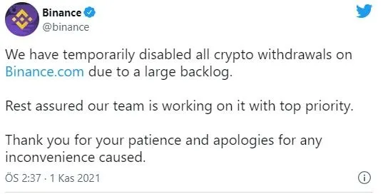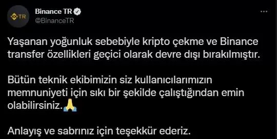 Binance'den yapılan açıklamada, kripto paralarda çekimlerin büyük ölçekli birikmiş işler nedeniyle kısa süreliğine askıya alındığı belirtilmişti.