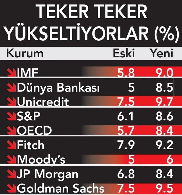 IMF, Dünya Bankası ve uluslararası kredi derecelendirme kuruluşları Türkiye için daha önce yaptıkları büyüme tahminlerini yükselterek revize etti. AK Parti'nin "Haftalık analiz Günhdemi" raporunda verilen bilgilere göre IMF 2021 için ekonomik büyüme tahminini yüzde 5.8'den 9'a, Dünya Bankası yüzde 5'ten 8.5'e, Standard and Poor's yüzde 6.1'den 8.6'ya, Ficth yüzde 7.9'dan 9.2'ye, Moody's 5'ten 6'ya, Unicredit de yüzde 7.5'ten 9.7'ye çıkardı.