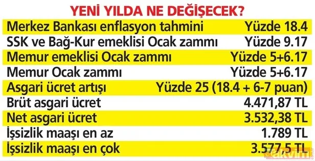 Milyonlarca çalışan ve emeklinin Ocak'ta geliri artacak. Yeni asgari ücret amacıyla Aralık'ta yapılacak komisyon toplantısı beklenirken, memurların ve memur emeklilerinin Ocak ayı zammında da 2021'in ikinci yarısındaki enflasyon belirleyici olacak. Geçen sene TÜFE Kasım'da yüzde 2.30, Aralıkta yüzde 1.25 artmıştı. Bu sene da benzer bir dizin artışı yaşanması durumunda bu senenin ikinci yarısındaki TÜFE artışı yüzde 10.5'e çıkacak. Yılın ilk 6 ayında yüzde 8.45 zam alan işçi emeklileri ikinci 6 ayda yüzde 10.5 zam daha alacak. Böylece 2021 senesi yüzde 19.9 zamla kapatılacak. İşte maaşa göre zam listesi
