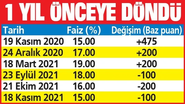 Eylül ve Ekim aylarında politika faizini toplam 3 puan indiren Merkez Bankası, dün de 1 puanlık indirim yaptı. Böylece faiz oranı 1 yıl öncesine döndü. Merkez Bankası Başkanı Şahap Kavcıoğlu başkanlığında toplanan Para Politikası Kurulu (PPK), politika faizi olan 1 hafta vade repo ihale faiz oranını yüzde 16'dan 15'e düşürdü.