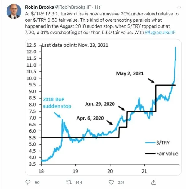 Brooks paylaşımında, o dönem de yüzde 30'un üzerinde bir değerlendirmeden söz etti. Brooks, TL'nin adil piyasa değerinin çok çok üstünde olduğunu vurguladı.