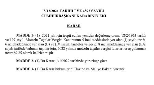 Söz konusu kararda "2021 yılı için tespit edilen yeniden değerleme oranı, 18 Şubat 1963 tarihli ve 197 sayılı Motorlu Taşıtlar Vergisi Kanununun 5'inci maddesinde yer alan (I) sayılı tarife, 6'ncı maddesinde yer alan (II) ve (IV) sayılı tarifeler ve geçeci 8'inci maddesinde yer alan (I/A) sayılı tarifede bulunan taşıtlar için, 2020 yılında motorlu taşıtlar vergisi tutarlarına uygulanmak üzere yüzde 25 olarak belirlenmiştir" denildi.