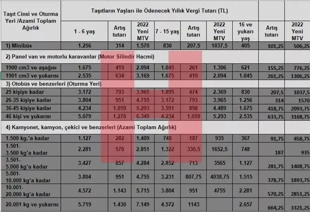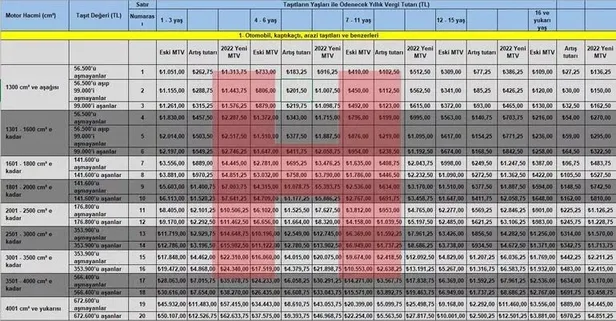 Bu artışla birlikte, 2022 yılı için 1-3 yaş arası, motor silindir hacmi bin 300 ve altı olanların ödeyeceği Motorlu Taşıtlar Vergisi tutarının bin 431 liraya çıkması bekleniyordu.