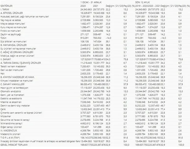 TİM verilerine göre, 2020 ve 2021 yılı ihracat rakamları, yüzdesel değişimler ve toplam içindeki paylar şöyle (bin dolar):