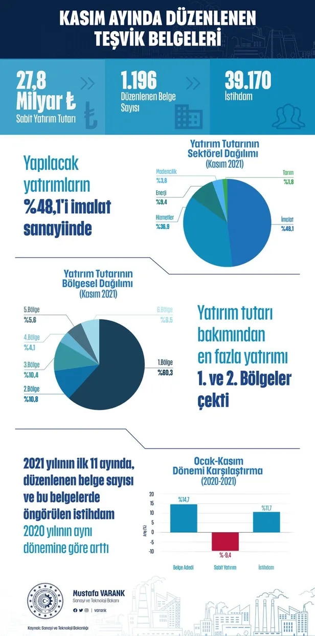 Sanayi ve Teknoloji Bakanı Mustafa Varank, Twitter hesabından "Yatırım, üretim, istihdam, ihracat" notuyla yaptığı paylaşımında, geçen yılın kasım ayında Sanayi ve Teknoloji Bakanlığı tarafından düzenlenen yatırım teşvik belgelerini değerlendirdi.