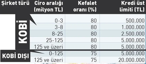 KOBİ'ler cirolarına göre 500 bin ila 5 milyon TL arasında kredi kullanabilecek. KOBİ dışı işletmeler ise azami 20 milyon TL tutarında krediden faydalanabilecek. Ticari kredi kartları ve banka kartına bağlı kredili mevduat hesabı üzerinden kullandırılacak kredinin kefalet oranları KOBİ'ler için yüzde 80, KOBİ dışı işletmeler için ise yüzde 75 olacak. Şirketler ya ticari kredi kartı ya da banka kartından bu krediyi kullanabilecek.