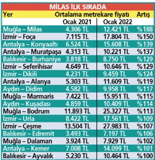 Listenin ikinci sırasındaki İzmir'in Foça ilçesinde ise son 1 yılda fiyat artışları yüzde 150'yi bulurken; yine İzmir'in Seferihisar ilçesinde yüzde 129, Dikili ilçesinde yüzde 124, Urla ilçesinde yüzde 109 ve Çeşme ilçesinde yüzde 107 artış oldu. Üçüncü sıradaki Antalya Konyaaltı'da ise fiyatlar yüzde 139 yükseldi.