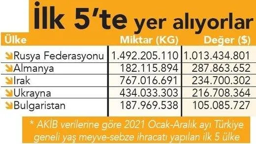 Akdeniz İhracatçı Birlikleri'nin 2020-2021 Ocak-Aralık ayı verilerine göre Rusya Türkiye'nin yaş meyve-sebze ihracatında lider konumda yer alıyor. Bu ülkeye yapılan yaş meyve-sebze ihracatı geçen yıl 1 milyar doları aşıyor. Ukrayna ise en çok ihracat yapılan 4'üncü ülke konumunda yer alıyor. Bu ülkeye geçen yıl yapılan yaş meyve-sebze toplam ihracatı 217 milyon dolara yaklaşıyor. Türkiye'nin yaş sebze ihracatında domates ilk sırada yer alırken bunu biber, kabak ve salatalık takip ediyor. Yaş meyve ihracatında ise üzüm ilk sırada yer alırken bunu kiraz, elma ve şeftali takip ediyor.
