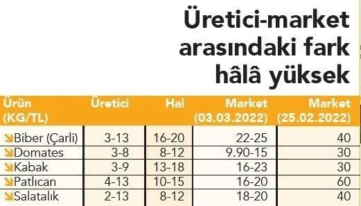 25 Şubat'ta İstanbul Hal'inde fiyatı 14 ila 18 TL arasında değişen, marketlerde ise 40 TL'ye kadar yükselen salatalık, Rusya- Ukrayna savaşının ardından üretimin merkezi olan Antalya'da 2 ila 13 TL, İstanbul Hal'inde 8 ila 12 TL, markette ise 18 ila 20 TL arasına kadar geriledi. 25 Şubat'ta İstanbul Hali'nde 10 ila 20 TL arasında olan, marketlerde fiyatı 30 TL'yi geçen domatesin fiyatı, dün üreticide 3 ila 8 TL, Hal'de 8 ila 12 TL, marketlerde ise 9.90 ila 15 TL'ydi.