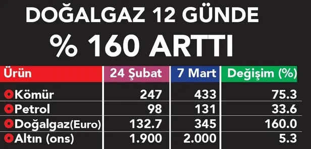 Rusya'nın Ukrayna'yı işgalinin doğal gaz arzında kesintiye yol açacağı endişesi Avrupa'da doğal gaz fiyatlarını rekor seviyeye taşıdı. Avrupa'da derinliği en fazla olan Hollanda merkezli sanal doğal gaz ticaret noktası TTF'de işlem gören nisan vadeli kontratların cuma günü megavatsaat başına 192.5 euro olan fiyatı, dün yüzde 80'e yakın yükselerek 345 euroya çıkarak tarihinin en yüksek seviyesini gördü. Rusya'nın Ukrayna'ya yönelik bombalama ve füze saldırılarından dolayı doğal gaz altyapısının zarar görmesi ve gaz akışının kesintiye uğrayabileceği endişeleri fiyatların artışını tetikledi. Avrupa'da doğal gaz fiyatları, Rusya-Ukrayna savaşının başlamasından bu yana 12 günde yaklaşık yüzde 160 arttı.