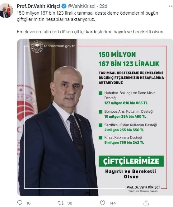 Bakan Kirişci, 150 milyon 167 bin 123 liralık tarımsal destekleme ödemelerini bugün çiftçilerimizin hesaplarına aktaracaklarını belirterek, "Emek veren, alın teri döken çiftçi kardeşlerime hayırlı ve bereketli olsun." değerlendirmesinde bulundu.