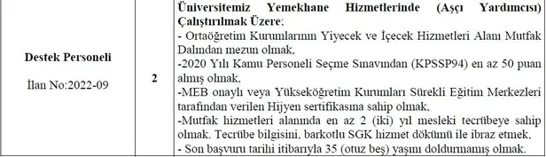 DESTEK PERSONELİ İÇİN ARANAN ÖZEL ŞARTLAR