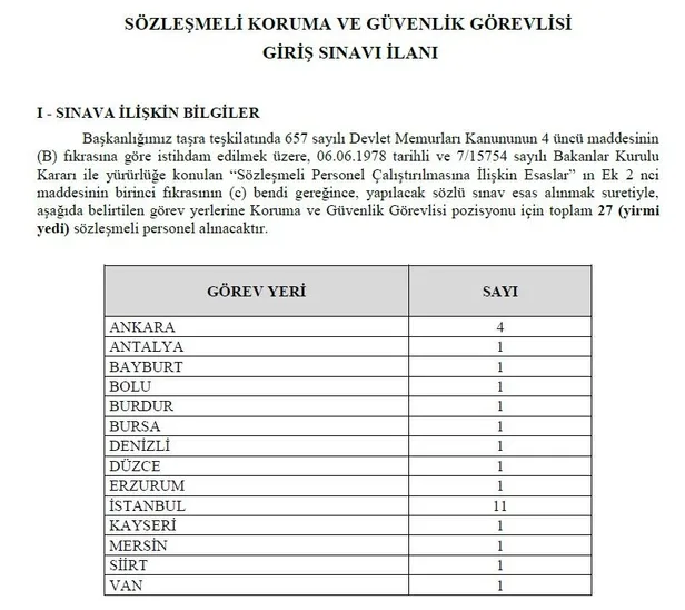 Başkanlığımız taşra teşkilatında 657 sayılı Devlet Memurları Kanununun 4 üncü maddesinin (B) fıkrasına göre istihdam edilmek üzere, 06.06.1978 tarihli ve 7/15754 sayılı Bakanlar Kurulu Kararı ile yürürlüğe konulan "Sözleşmeli Personel Çalıştırılmasına İlişkin Esaslar" ın Ek 2 nci maddesinin birinci fıkrasının (c) bendi gereğince, yapılacak sözlü sınav esas alınmak suretiyle, aşağıda belirtilen görev yerlerine Koruma ve Güvenlik Görevlisi pozisyonu için toplam 27 (yirmi yedi) sözleşmeli personel alınacaktır.