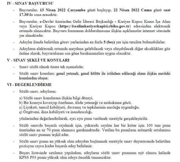 - Başarı listesinde sıralama yapılırken, adayların sözlü sınav puanının eşit olması halinde KPSS P93 puanı yüksek olan adaya öncelik tanınacaktır.