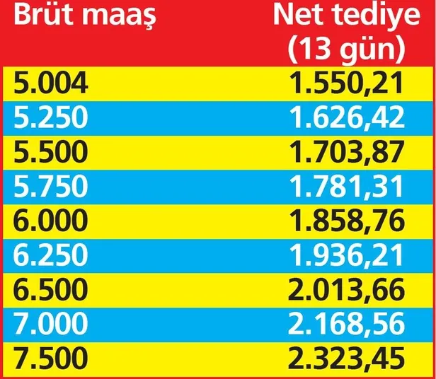Yapılacak en düşük ödeme net bin 550 lira (asgari ücretlilere) olacak. Maaşı brüt 7 bin 500 lira olan işçiye ise 13 günlük ödeme olarak net 2 bin 323 lira verilecek.