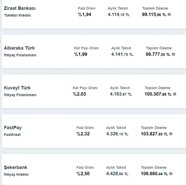 25.000 TL kredi kullanmanız durumunda, 36 ay vadede 1.99 faiz seviyesiyla kredi sunulmaktadır.