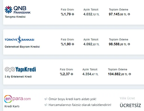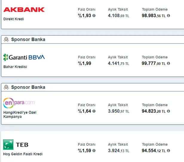 50.000 TL kredi kullanmanız durumunda, 36 ay vadede 1.99 faiz seviyesiyla kredi sunulmaktadır. 100.000 TL kredi kullanmanız durumunda, 24 ay vadede 1.99 faiz seviyesiyla kredi sunulmaktadır.