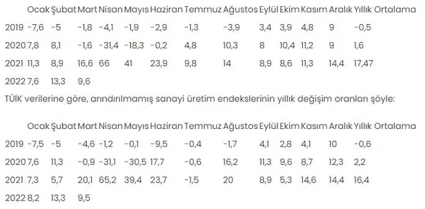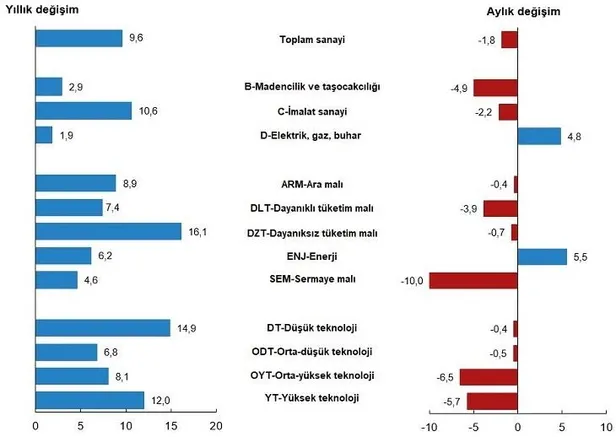 TÜİK verilerine göre, sanayi üretim endekslerinin takvim etkisinden arındırılmış yıllık değişim oranları şöyle: