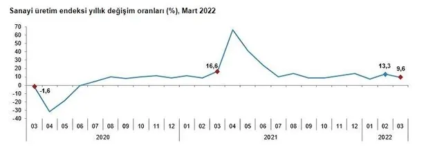 Son dakika haberi! Sanayi üretimi yıllık %9,6 arttı. Sanayinin alt sektörleri (2015=100 referans yıllı) incelendiğinde, 2022 yılı Mart ayında madencilik ve taşocakçılığı sektörü endeksi bir önceki yılın aynı ayına göre %2,9, imalat sanayi sektörü endeksi %10,6 ve elektrik, gaz, buhar ve iklimlendirme üretimi ve dağıtımı sektörü endeksi %1,9 arttı.