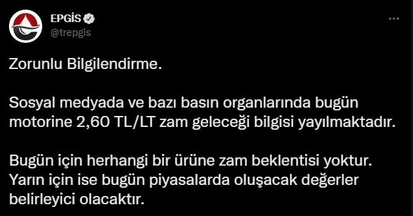 Yapılan açıklamada, "Zorunlu Bilgilendirme. Sosyal medyada ve bazı basın organlarında bugün motorine 2,60 TL/LT zam geleceği bilgisi yayılmaktadır. Bugün için herhangi bir ürüne zam beklentisi yoktur. Yarın için ise bugün piyasalarda oluşacak değerler belirleyici olacaktır." denildi.