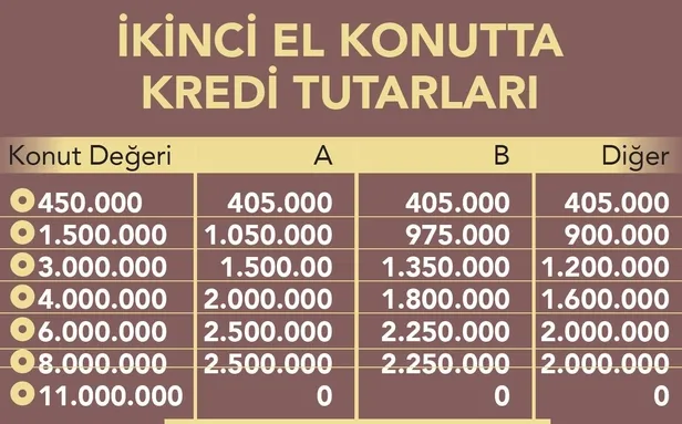 Yani vatandaş 450 bin liralık ikinci el konut aldığında tüm sınıflarda yüzde 90'ına denk gelen 405 bin liralık kredi kullanabilecek. Değeri 500 bin ile 2 milyon lira arasındaki ikinci el A enerji sınıfı ev için ise yüzde 70 oranında kredi kullanılacak. Evin değeri 2 milyon TL ise bankadan 1.4 milyon liraya kadar kredi kullanılabilecek. BDDK kararının konut fiyatlarında son dönemdeki şişkinliği azaltması bekleniyor.