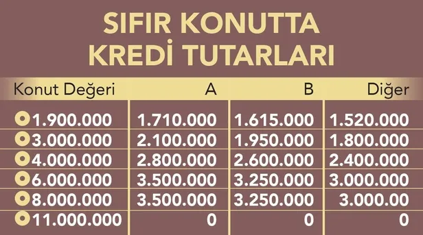 Yeni düzenlemeyle, 10 milyon TL üzerinde olan konutlara kredi verilmeyecek. Vatandaş 1 milyon 900 bin liralık ev satın aldığında, A enerji sınıfında ise yüzde 90'ını yani 1 milyon 710 bin lira, B enerji sınıfında ise yüzde 85'i yani 1 milyon 615 bin lira, diğer sınıflarda ise yüzde 80'i 1 milyon 520 bin liraya kadar kredi kullanabilecek. Konut değeri 3 milyon lira ise A enerji sınıfında yüzde 70'i yani 2 milyon 100 bin lira, B'de yüzde 65'i yani 1 milyon 950 bin lira, diğer sınıflarda ise yüzde 60'ına denk gelen 1.8 milyon TL'ye kadar kredi kullanılabilecek. 500 bin ila 2 milyon lira arasındaysa A enerji sınıfında yüzde 70'ine, B enerji sınıfında yüzde 65'ine diğer enerji sınıflarında yüzde 60'ına kadar kredi verilebilecek.